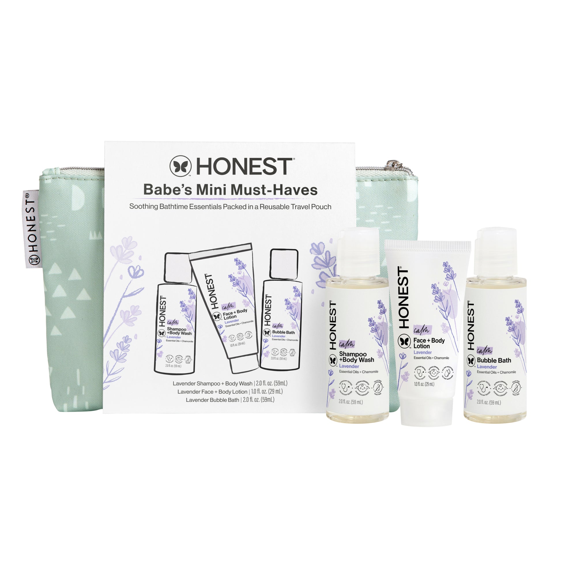 Traveling for the first time with babe? We've got you covered with the bathtime essentials! Our reusable, travel-friendly pouch has all the Honest fam-faves minis for cleaning + soothing on the go.