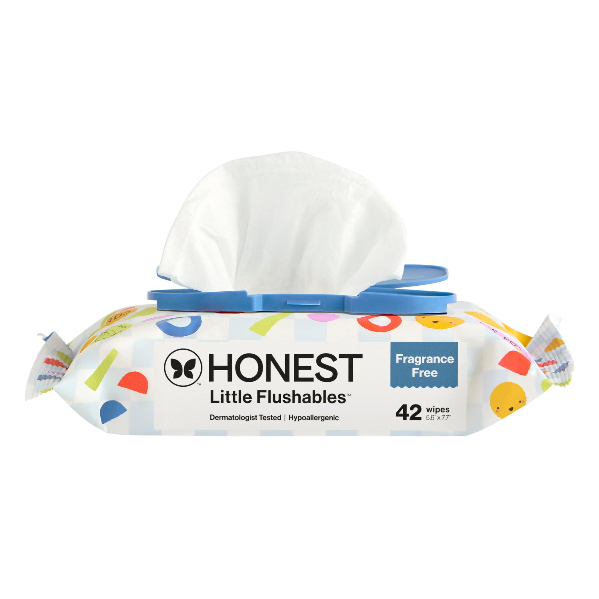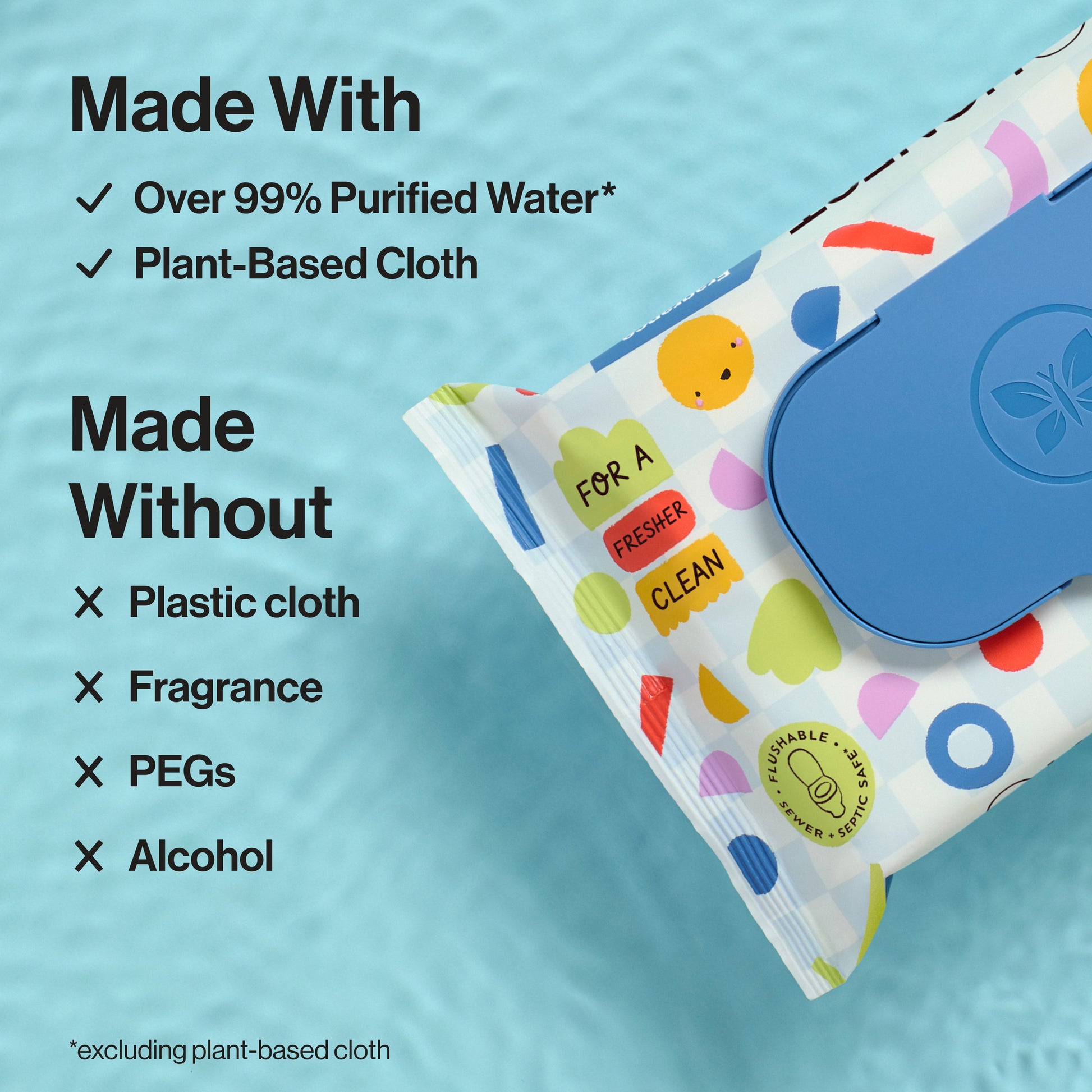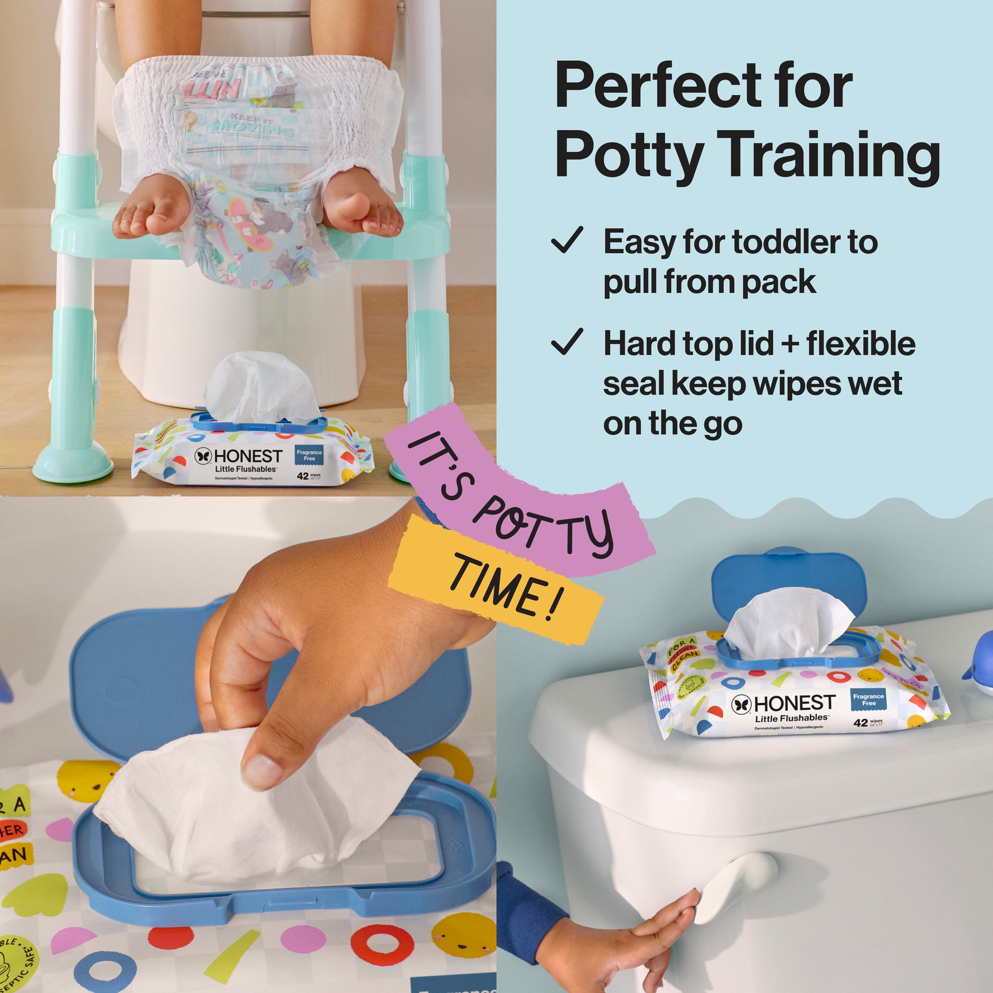 The perfect potty-training sidekick! Little flushable Wipes are designed to give toddler’s afresh + easy clean. Formulated with over 99% water + plant-based cloth, making them soft + gentle on toddler’s skin. Our hypoallergenic, pediatrician-tested wipes are designed for toddler’s tiny hands and are easy to carry for on-the-go cleanups.