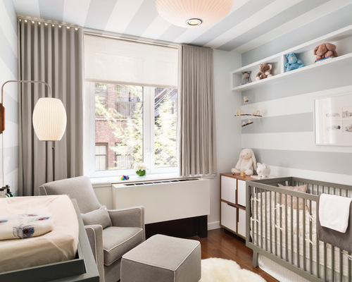 1. Choose a neutral color palette.Often when people consider which colors to use in a nursery, they think of pastels. But long gone are the days when nurseries could be only soft blues, pinks, greens and yellows. Today, regardless of the sex of the child, consider using neutrals. In this example, the main colors are variations of gray layered with the freshness of white and yellow. The room is gender-neutral and not too baby-like.